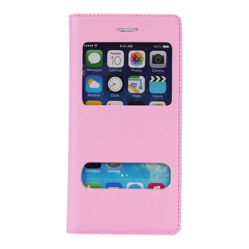 iPhone 6 Plus / 6s Plus S View Deri Dikişli Çift Pencereli Kılıf Pembe